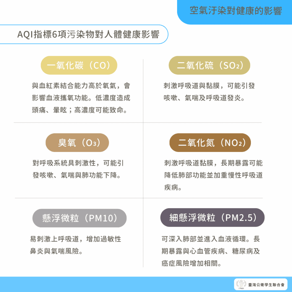 - (1)懸浮微粒(PM10):容易造成過敏性鼻炎,引發咳嗽、氣喘等危害。