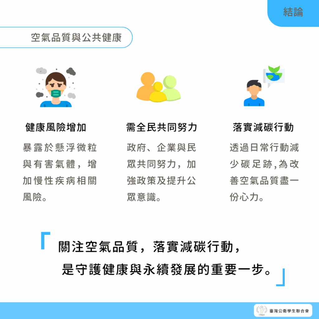 業與個人的共同努力,包括推動清潔能源、加強環保政策以及提升公眾意識。我們每個人都能透過日常行動減少碳足跡,為改善空氣品質盡一份心力。空氣汙染的影響雖可能不易察覺,但其累積效應不容忽視。關注科學研究結果,支持相關改善措施,是維護健康與實現永續發展的重要一步。