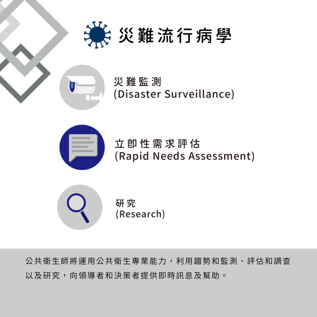 描述災難對於健康的不良影響並提出對應的處理方案,確定與災害相關的後續事件狀況及發生條件,並了解不良健康影響在特定族群中的分布,比如處理災害的第一線消防人員。 - 立即性需求評估(Rapid Needs Assessment)