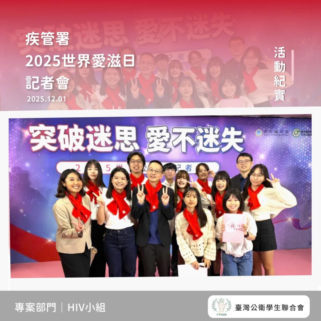 社團法人臺灣公衛學生聯合會(以下簡稱本會)為響應世界衛生組織訂定的世界愛滋日,於昨日(12/1)非常榮幸受衛生福利部疾病管制署之邀請,於「2025 世界愛滋日」記者會演唱 HIV 創作歌曲〈一樣 As Usual〉,持續為愛滋平權發聲。本次演出更首次發表全新的中、英、日文混編版本,期待透過多語言的創作串連國際,讓青年的熱情跨越語言與文化界線,傳遞共同的愛與支持。