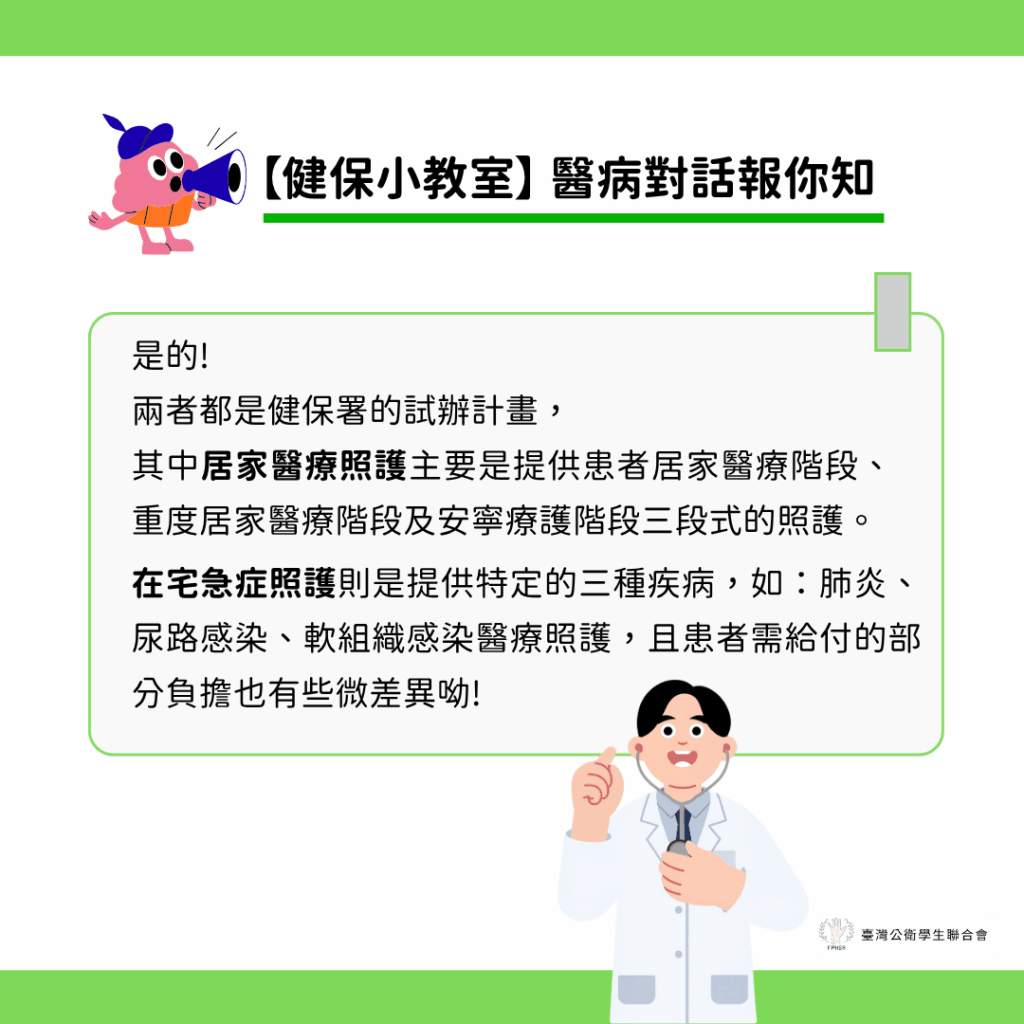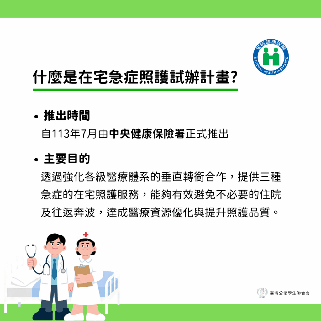 自113年7月由中央健康保險署正式推出在宅急症照護試辦計畫,其計畫目的為透過強化各級醫療體系的垂直轉銜合作,提供三種急症的在宅照護服務,能夠有效避免不必要的住院及往返奔波,達成醫療資源優化與提升照護品質。