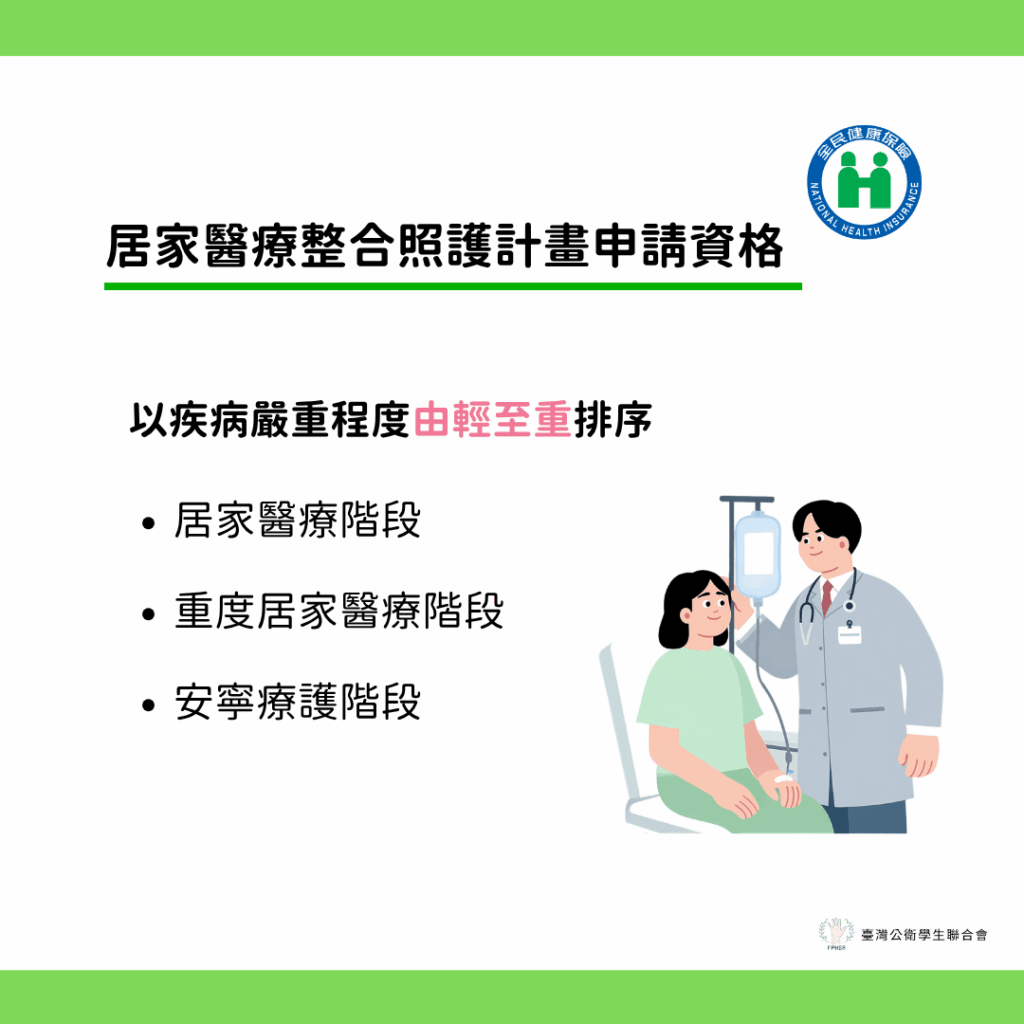 - 居家醫療階段:限居住於住家(不含照護機構),且經照護團隊醫事人員評估有明確醫療需求,因失能或疾病特性致外出就醫不便者。