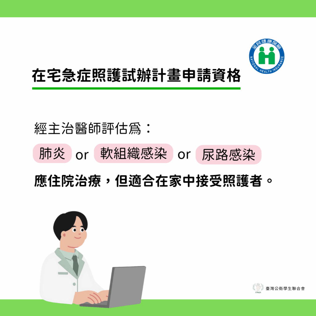 經主治醫師評估為肺炎、尿路感染、軟組織感染,應住院治療但適合在宅接受照護者,且須符合下列條件之一: