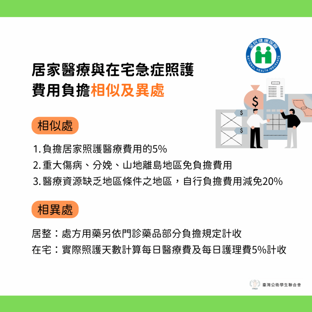 - 患者或其家屬應自行負擔之醫療費用依全民健康保險法第四十三條居家照護規定,並以實際照護天數計算每日醫療費及每日護理費之百分之五計收。