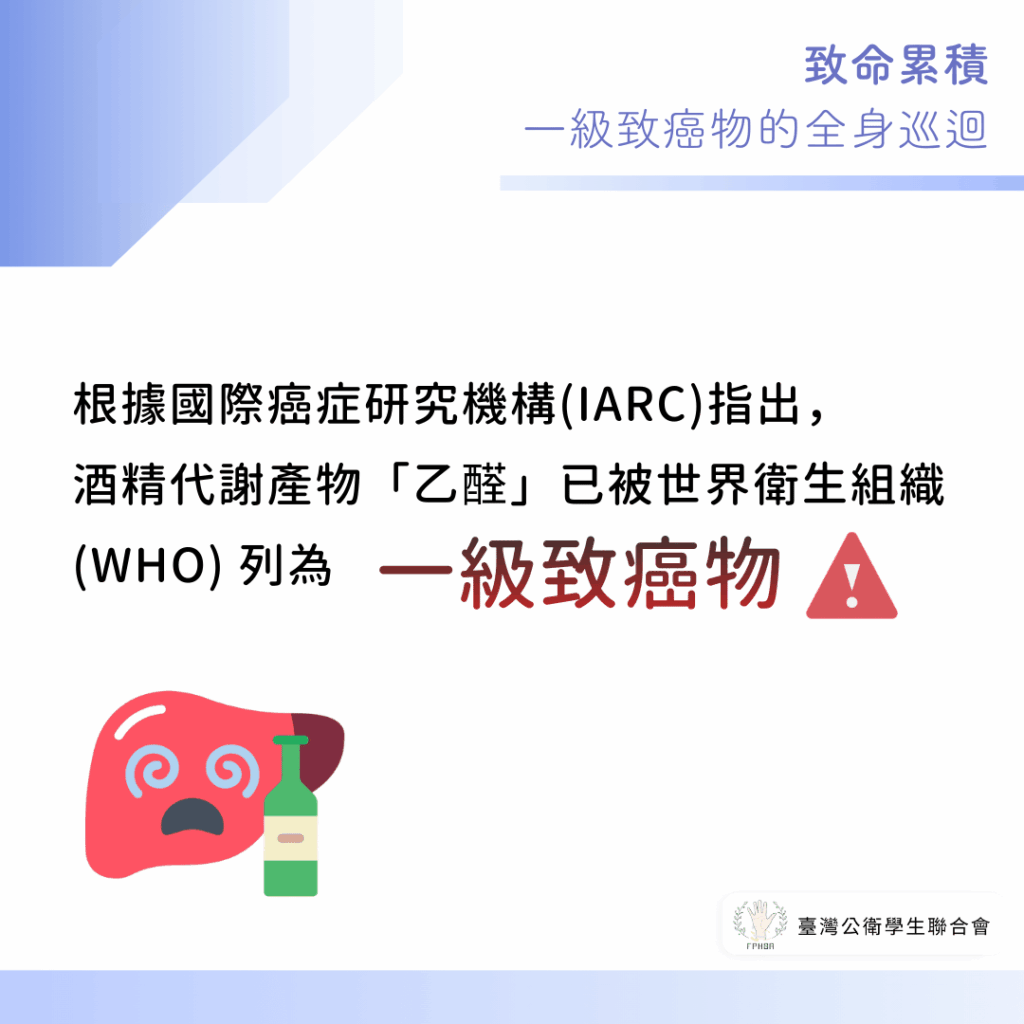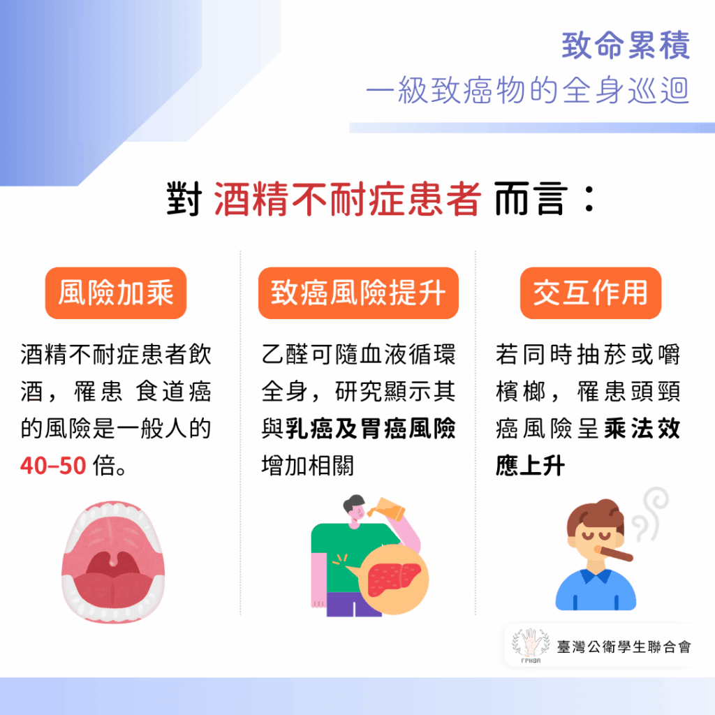 根據台灣酒精不耐症衛教協會指出,酒精在體內代謝產生的「乙醛」已被世界衛生組織(WHO)列為一級致癌物。對於酒精不耐症患者而言: