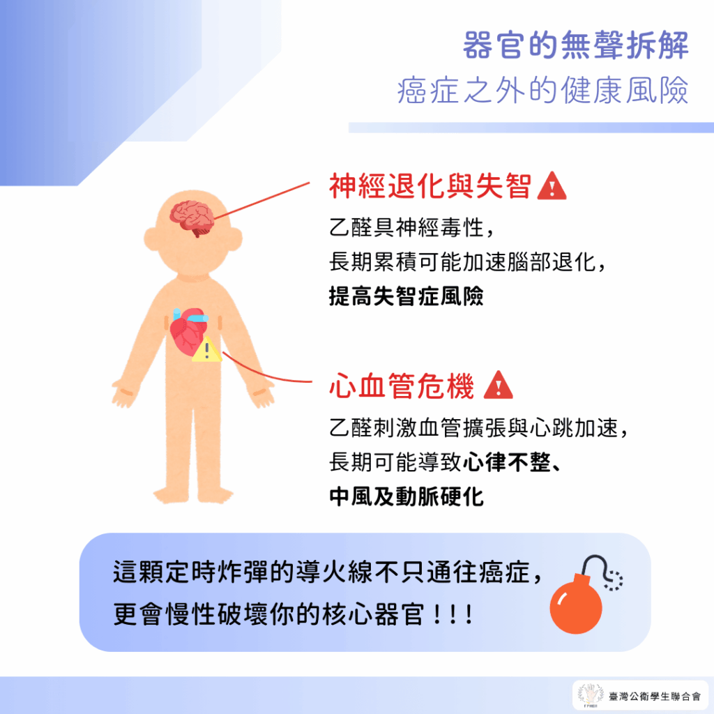 👉致癌風險提升:乙醛會隨血液循環全身,研究證實這也會顯著提升乳癌與胃癌的風險。