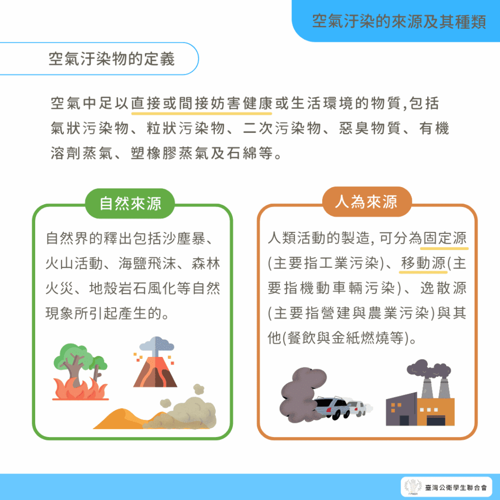 空氣汙染是因空氣中存在著空氣汙染物。空氣汙染物是空氣中足以直接或間接妨害健康或生活環境的物質,包括氣狀污染物、粒狀污染物、二次污染物、惡臭物質、有機溶劑蒸氣、塑橡膠蒸氣及石綿等。空氣汙染物的來源很多樣,主要為「自然界的釋出」以及「人類活動的製造」。自然界的釋出包括沙塵暴、火山活動、海鹽飛沫、森林火災、地殼岩石風化等自然現象所引起產生的;而人類活動的製造,可分為固定源( 主要指工業污染) 、移動源( 主要指機動車輛污染) 、逸散源( 主要指營建與農業污染) 與其他( 餐飲與金紙燃燒等) ,如下圖所示。