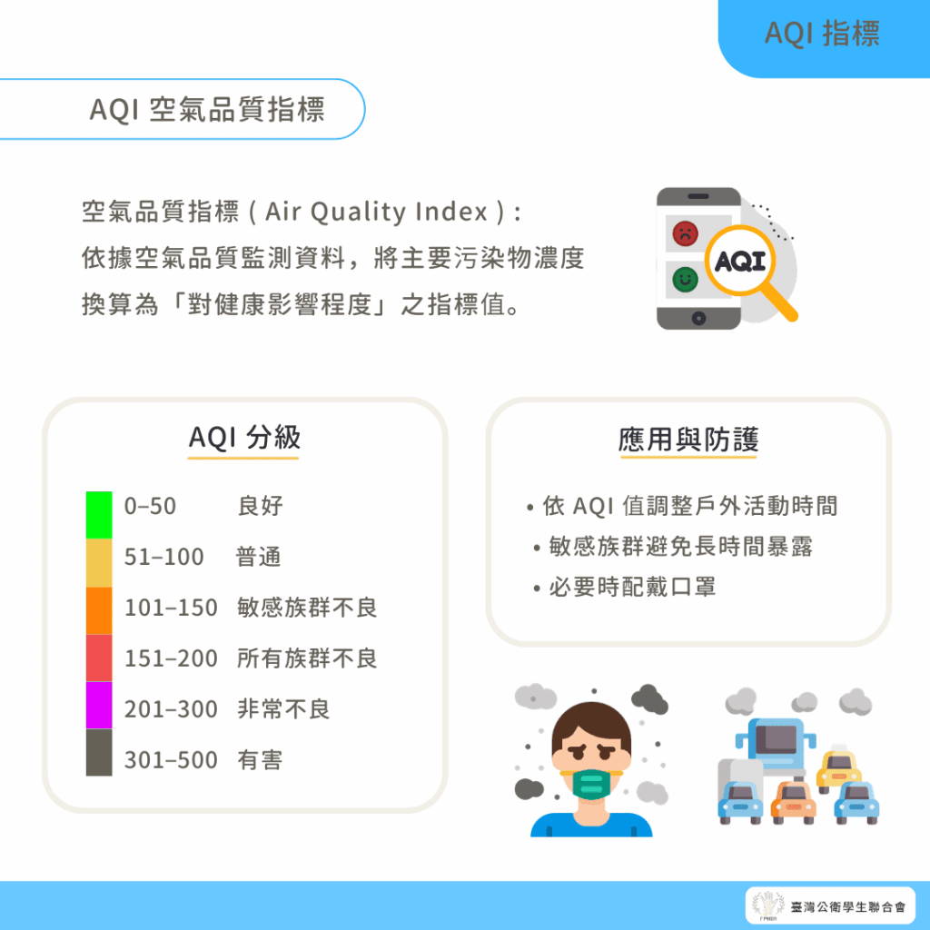 - AQI(Air Quality Index)「空氣品質指標」由空氣品質監測站之空氣污染物濃度監測結果換算而得 AQI 值。