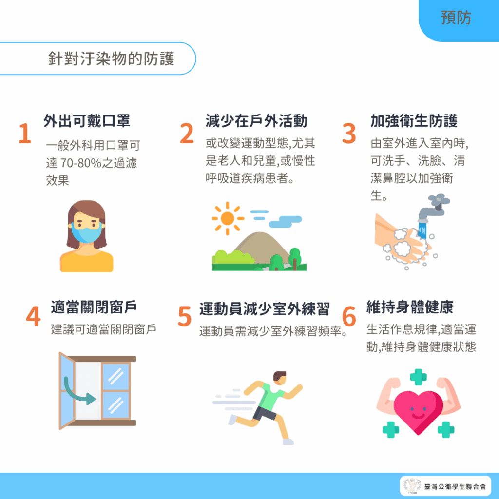 - 應減少在戶外活動時間,或改變運動型態,尤其是老人和兒童,或慢性呼吸