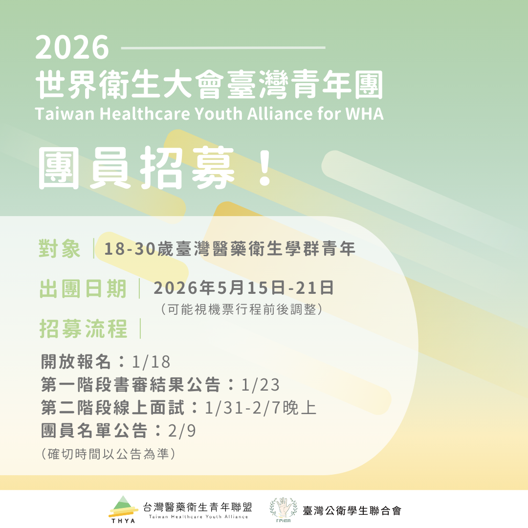 臺灣公衛學生聯合會近年逐步跨足國際事務,並與各醫藥衛生相關領域組織緊密合作。未來期望能提升學生對公共事務、國際事務的關心,一同創造更多國際交流的可能性,鼓勵同學一起走向國際!