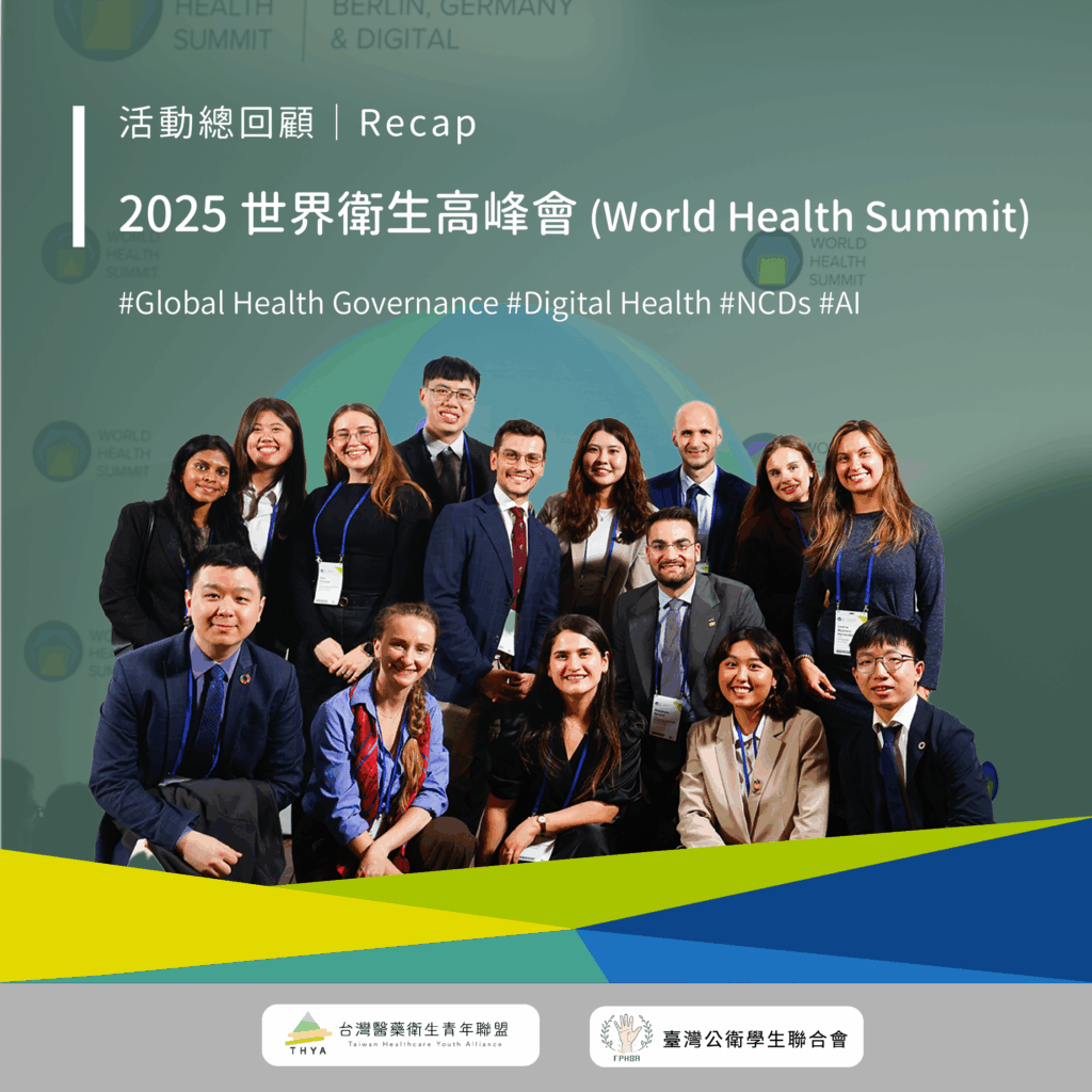 本會與台灣醫藥衛生青年聯盟(THYA)今年首度共同組成「世界衛生高峰會台灣青年代表團」,共計8位具公共衛生、醫學及藥學背景的青年參與。本次會議於10月12日至14日於德國柏林舉行,匯集超過400位講者、4000位現場參與者,並舉辦多達85場主題活動,是繼世界衛生大會(WHA)之後全球能見度最高的衛生盛會之一。除了國際專家學者、NGO領袖與產業界代表外,現場更有來自世界各地的青年組織參與,為健康議題帶來多元視角與創新思維,開啟了眾多跨國合作的契機。
