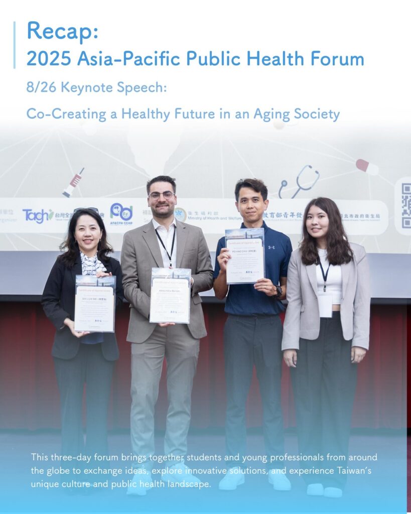 今年(2025)8月26日至28日,亞太公衛論壇於台大公衛學院盛大舉行,以「The Aging Era and Global Health」為主題,聚焦高齡化時代下的健康挑戰與創新行動。活動吸引來自4國超過80位青年,共同以多元觀點探討如何在全球化浪潮中實現健康老化。論壇邀請到衛福部國健署魏璽倫副署長、臺灣公衛學生聯合會理事長吳俞萱、世界公共衛生學會聯盟青年部(Young WFPHA)秘書Federica Castellana 致開幕詞,鼓勵青年運用所長發揮影響力。