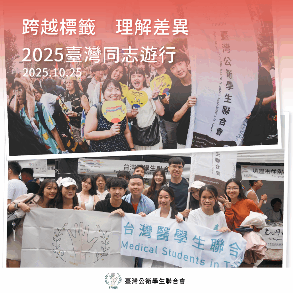 社團法人臺灣公衛學生聯合會於10月25日,以團體身分再次參與第23屆臺灣同志遊行,與 臺灣青年民主協會 TYAD 、 FMS-Taiwan 社團法人台灣醫學生聯合會 等團體齊聚於臺北市政府前廣場。今年度為本會自2021年來第五度邀請同學一同參與大遊行,我們長期關注各項議題,透過每年度實際行動的展現,彰顯對多元與平等的支持。