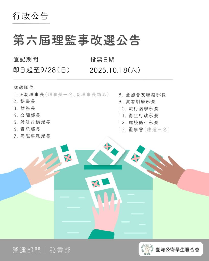一年一度的理監事改選即將起跑,歡迎有熱忱、具幹部領導經驗、對於公衛議題推廣與活動舉辦有興趣的大家,一同加入公衛聯會大家庭!