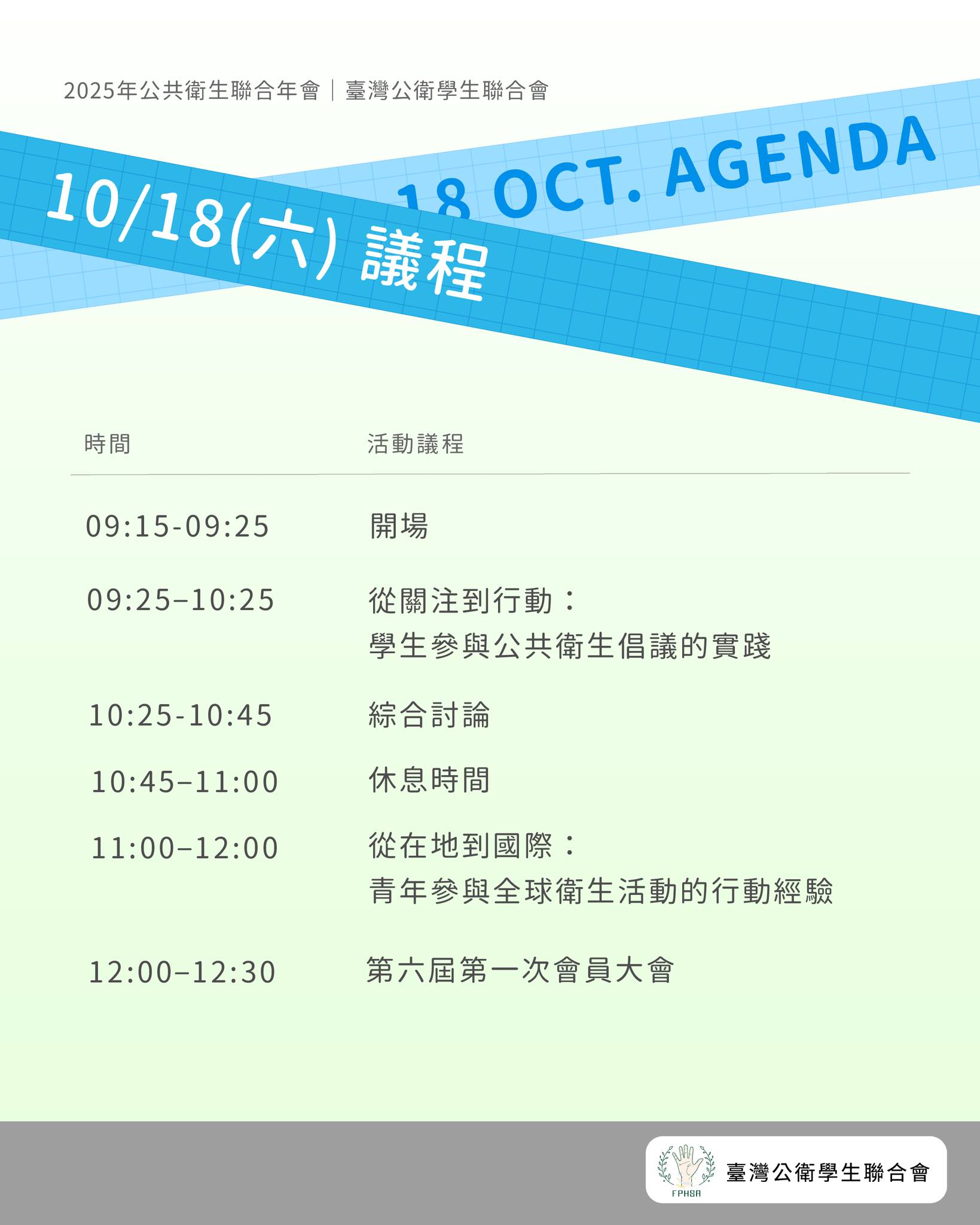• 12:00-12:30|臺灣公衛學生聯合會第六屆第一次會員大會(辦理第六屆理監事選舉)