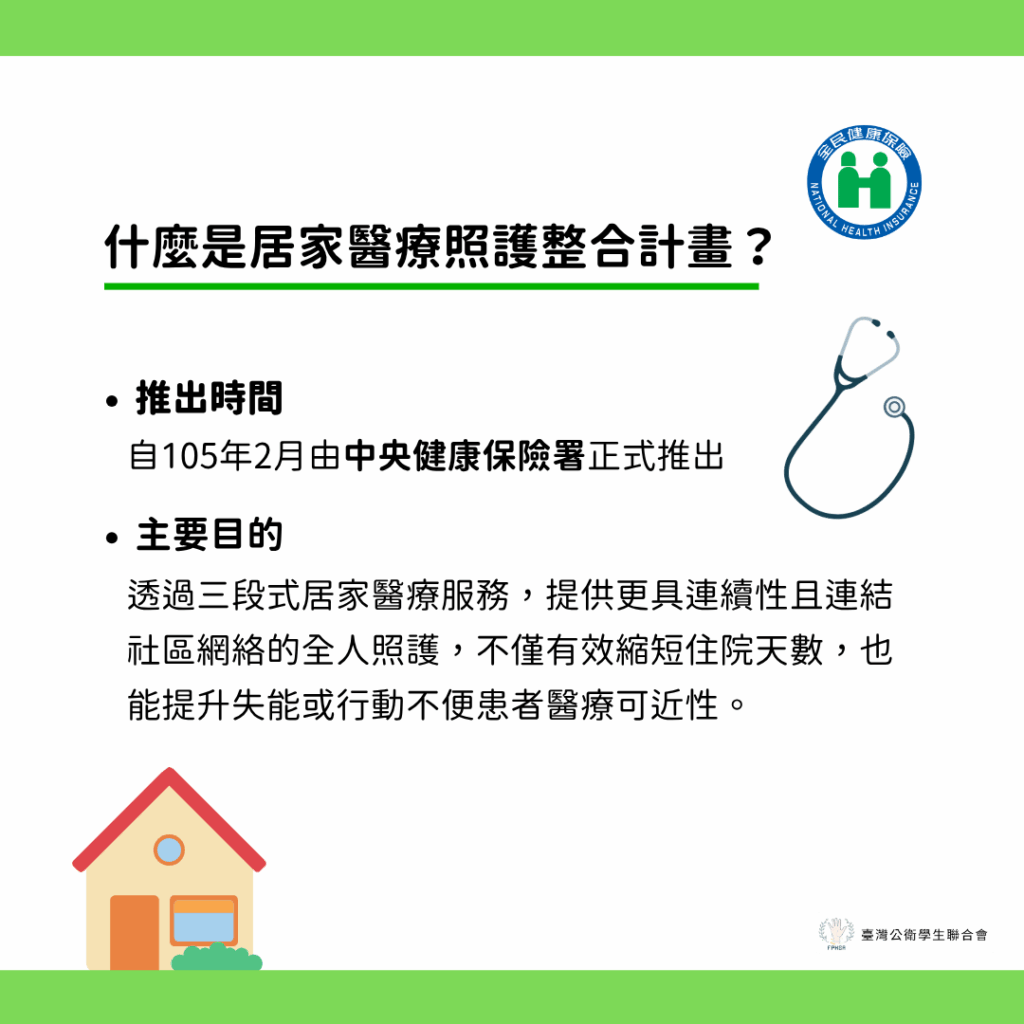 自105年2月由中央健康保險署正式推出的居家醫療照護整合計畫,其計畫目的為透過三段式居家醫療服務,提供更具連續性且連結社區網絡的全人照護,不僅有效縮短住院天數,也能提升失能或行動不便患者醫療可近性。